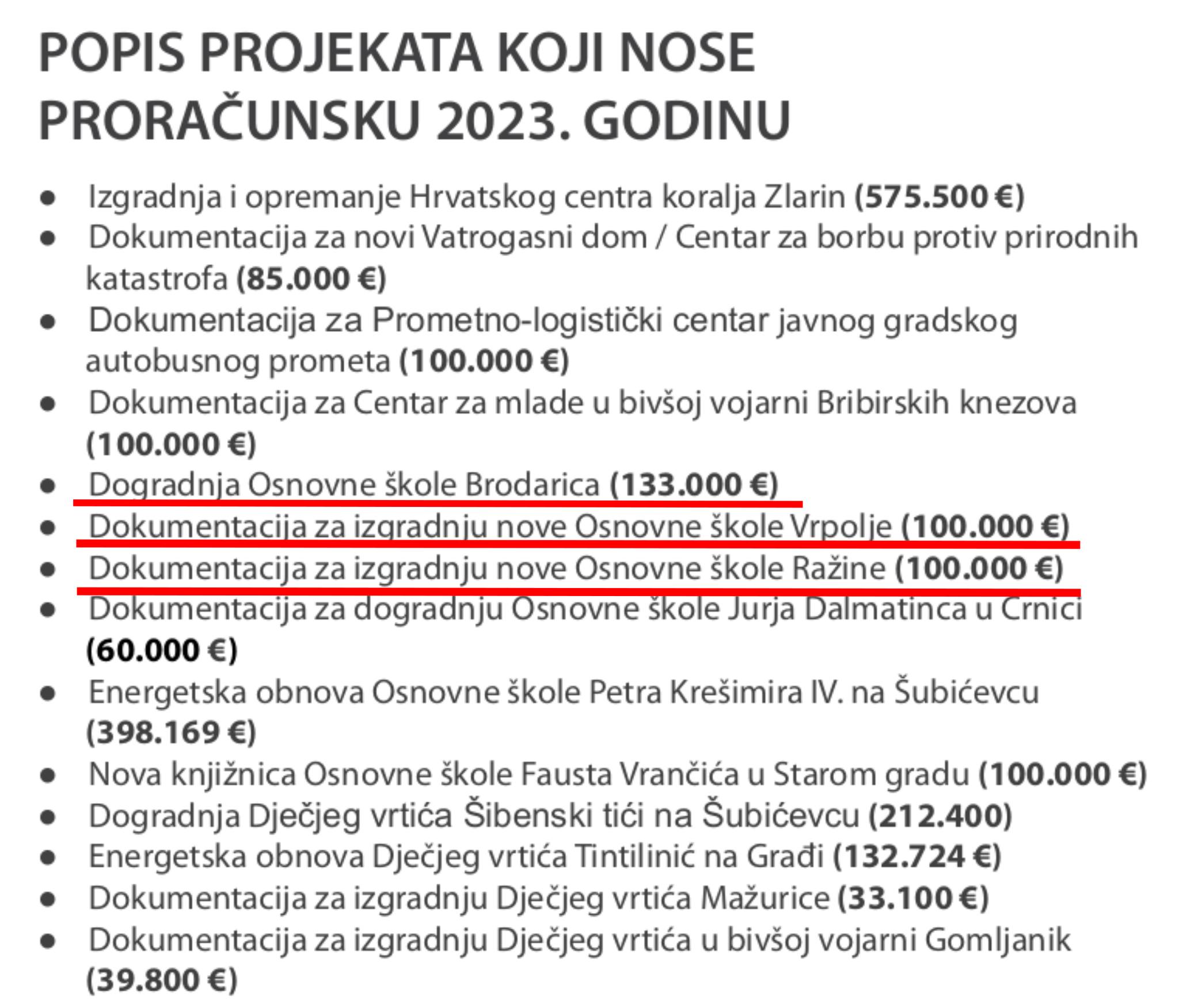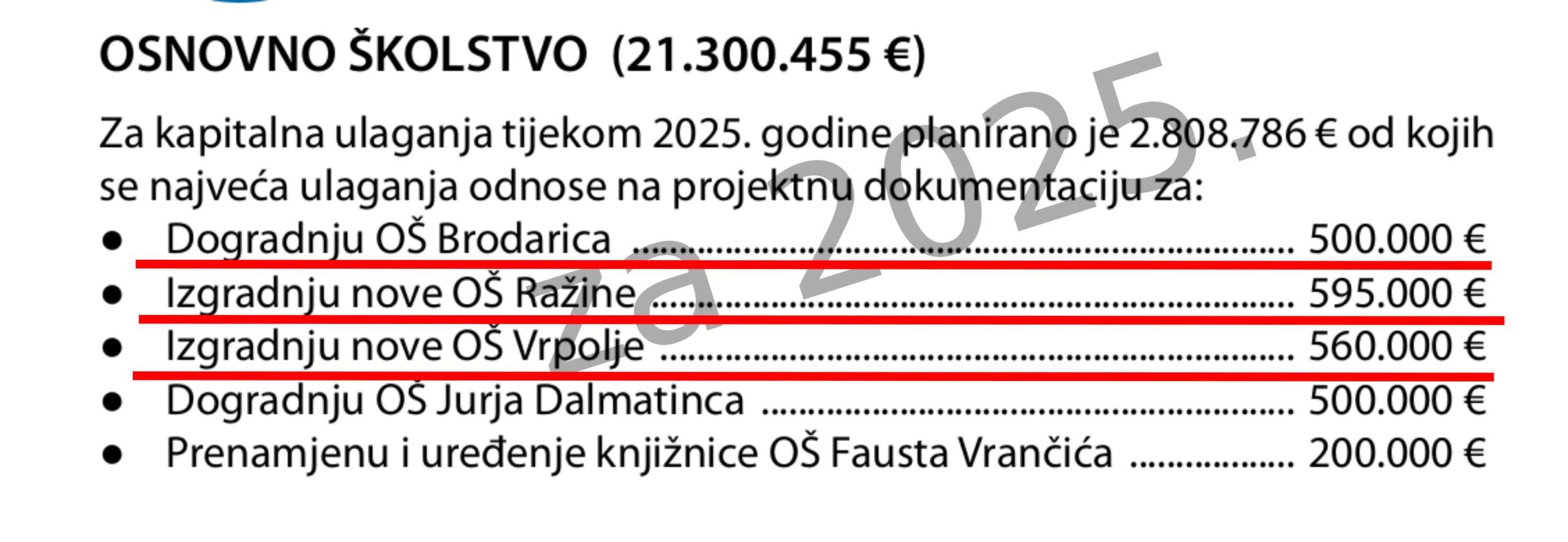 Copy paste proračuni se nastavljaju. Silne stotine tisuća eura samo za projektnu dokumentaciju, bez deka cementa ili ijedne opeke. Javna potrošnja je potpuno van svake kontrole, ali doduše u ovom slučaju ni ne potroše jer se projekti OŠ Brodarica i izgradnja nove škole u Vrpolju ne miču s mrtvog mjesta dugi niz godina. Da stvar bude još luđa iz godine u godinu povećavaju cifre koju namjene za te papirušine. Došli smo s 500.000 kn do 560.000€, to je povećanje od 8x!