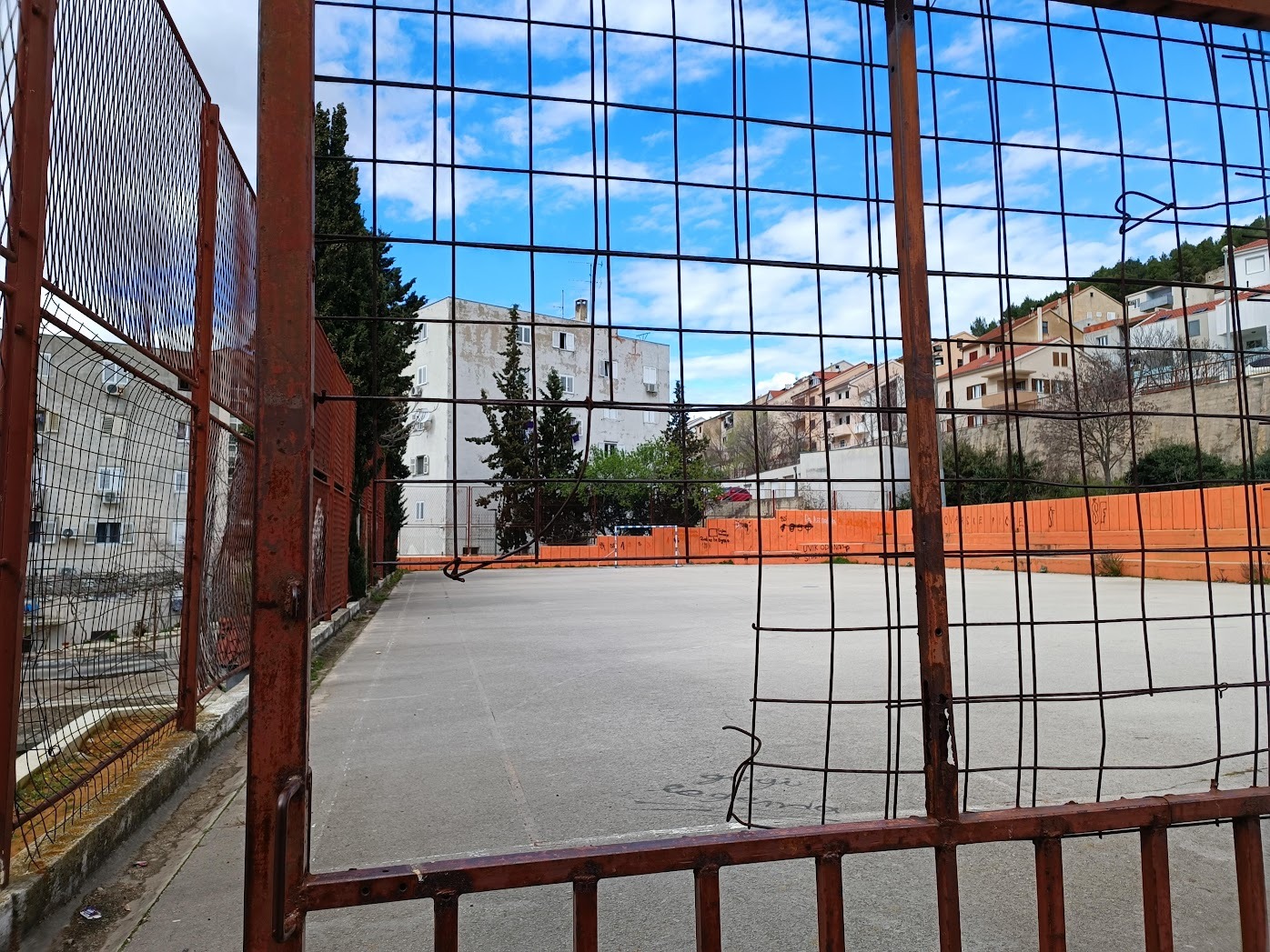 Vanjsko igralište od OŠ Petra Krešimira IV, tj. preciznije ograde su kriminalne. Ovdje djeca trče i zalijeću se, i mogu se lako nasaditi na ruzinavu ogradu koja na mjestima strši van i baš izgleda opasno. Ovo je armatura koja glumi ogradu i nije predviđena da bude čvrsta na takav način i s vremenom se pohabalo. Nevjerojatno da vodstvo škole ovo dozvoljava da stoji ovako!