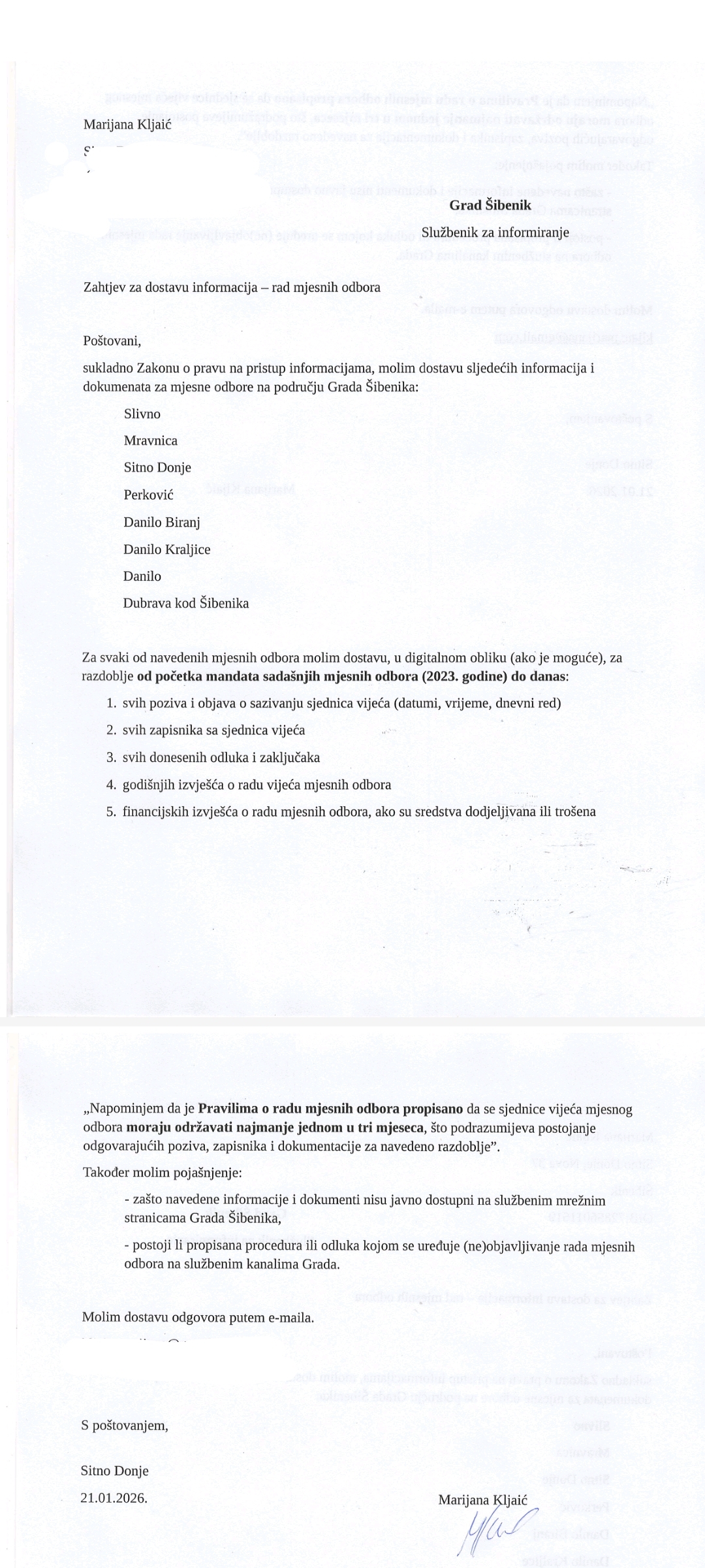 Ovaj tjedan poslala sam upit Gradu i pročelniku Jošku Juriću da mi dostave zapisnike sa sjednica vijeća MO za par mjesta van grada. Odgovor već znam (jer zapisnika nema), no zanima me opravdanje i kada planiraju početi raditi po zakonu.