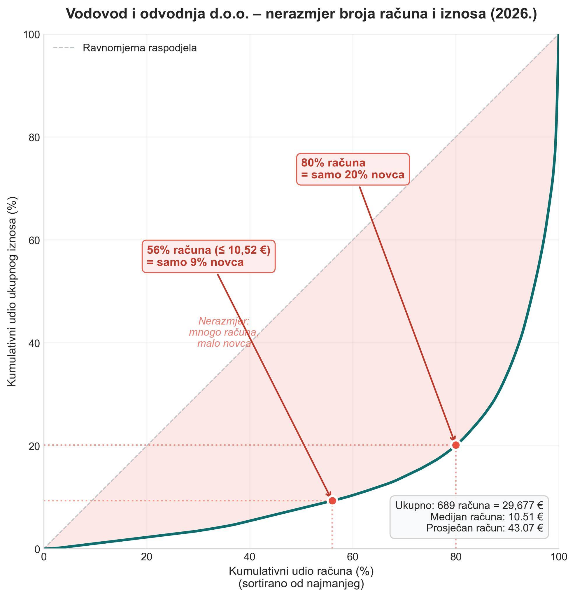 Ružičasta površina između krivulje i dijagonale prikazuje koliko je raspodjela iskrivljena, grad obrađuje stotine bankovnih transakcija za minimalne iznose. To znači administrativni trošak obrade svakog pojedinog računa (nalog za plaćanje, knjiženje, ovjera) koji, poznavajući birokraciju, može premašiti sam iznos računa kod onih najmanjih od 5,25 €.