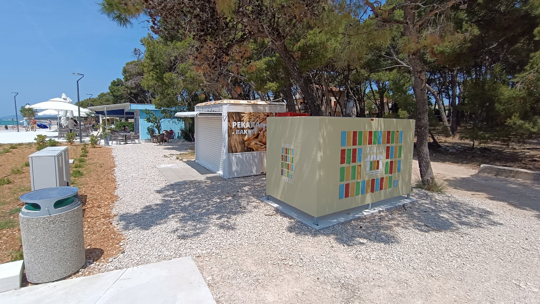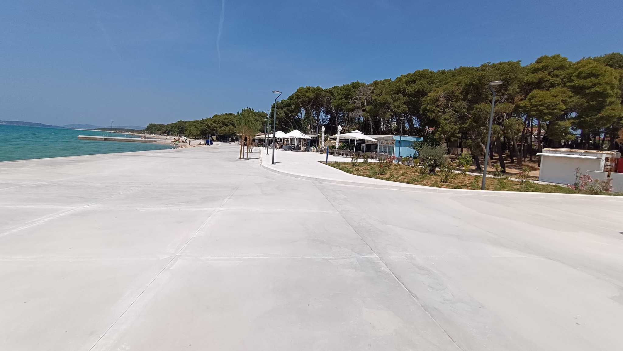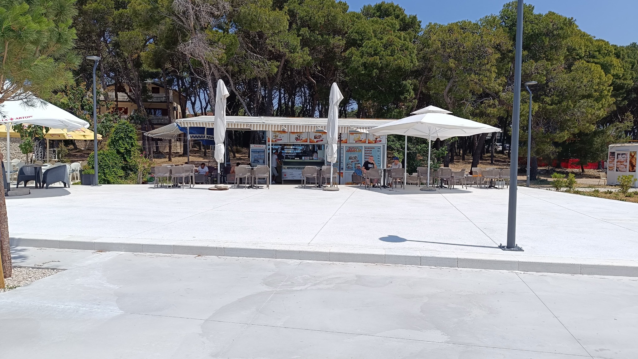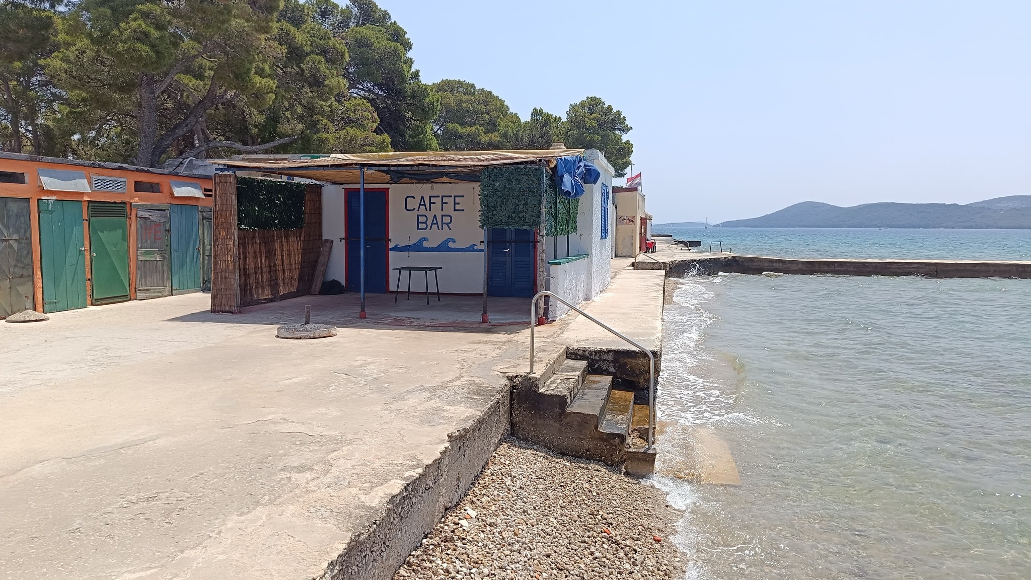 Osim Rašija i čuvenih krafni još su dva cafe bara otvorena uz njega ali bez ičega u ponudi za pod zub. Srećom trafika otvara kroz koji dan a i pekara uz more te ona na ulazu. A i dućan na ulazu uskoro otvara. Restoran uz dućan je isto već počeo sa radom. Nažalost onaj uz balotanu izgleda neće raditi ni ove godine. A hrpa crnih vreća sa smećem koju su ostavili na terasi restorana bode u oči a komunalci nemaju ovlasti za odvesti ih. Platna koja dijele restoran od balotane su većinom potrgana. Kod kabina bi trebalo izbrusiti onaj smeđi sloj na rivi uz tuš i dalje prema stepenicama za ulaz u more. Kad je mokar sklizak je. Jedne sezone se to odradilo ali treba opet.