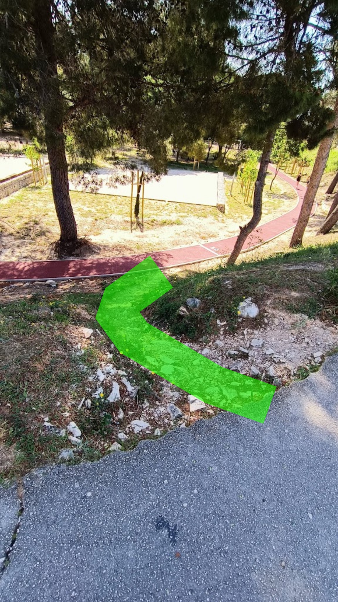 Navodno su se ogromna sredstva potrošila (spominje se 400.000€) na uređivanje 300m trim staze i teren za petanke, a neke osnovne i apsolutno trivijalne stvari opet, po stoti put, nisu odrađene. Naime, iz smjera gdje su nove POS-ove zgrade ulaz je katastrofalan (1. i 2. slika) i dapače opasan. Opet ništa od stuba? Ista stvar i sa sjevero-zapadnim ulazom, ostavili su ulaz nakaradnim i nisu ni taknuli.