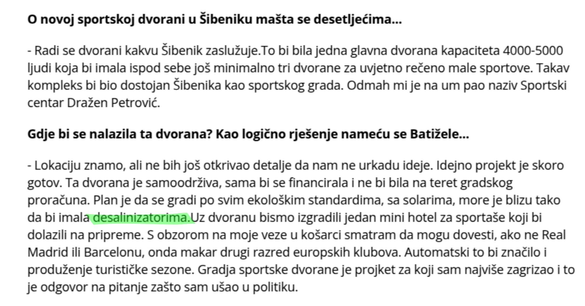 No, postavlja se pitanje bi li takav sportski centar zaista bio toliko udaljen od vodovodne infrastrukture da bi zahtijevao skupa postrojenja za desalinizaciju vode? Zar nije jednostavnije i jeftinije dovesti vodu iz gradskog vodovoda? To su ogromna i kompleksna postrojenja, nema smisla za jedan sportski centar to graditi. Svakako se ne mora plašiti da će netko ukrasti ideju o desalinizaciji.